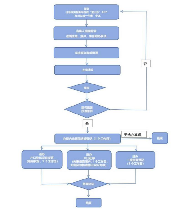1.登錄山東政務服務網(wǎng)—“高效辦成一件事”平臺—“結婚落戶一件事”模塊;